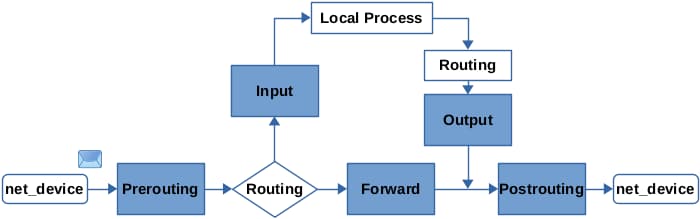 filter,route,nat,每种类型功能不一样,能在什么hook工作也不一样,比如redirect需要在nat类型进行。在iptables体现为4个预先定义的表(raw,mangle,nat,filter),并且默认定义了优先级不能改。 - hook: