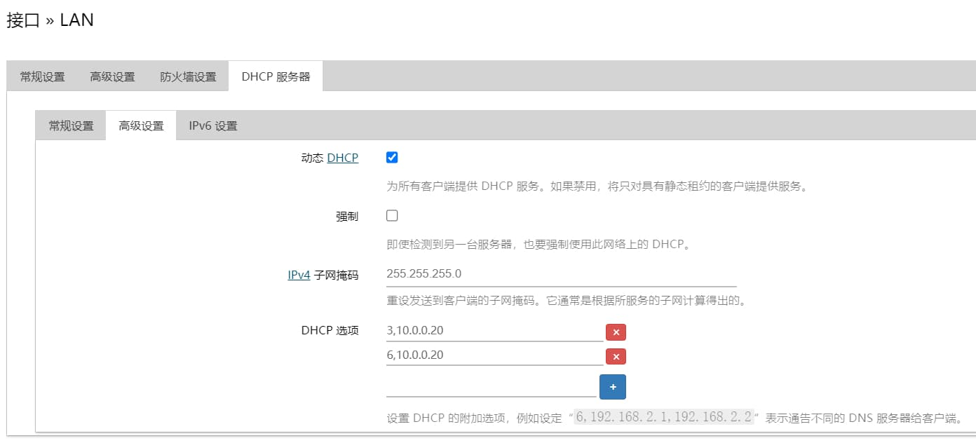 将局域网其他设备的网关和DNS服务器手动指定到该机器上,测试看看是否正常工作。没问题后可以在主路由器的DHCP附加选项(dhcp_option)中将网关和DNS服务器自动通告给客户端,这样就不用在其他设备手动指定了,这里以OpenWrt为例: